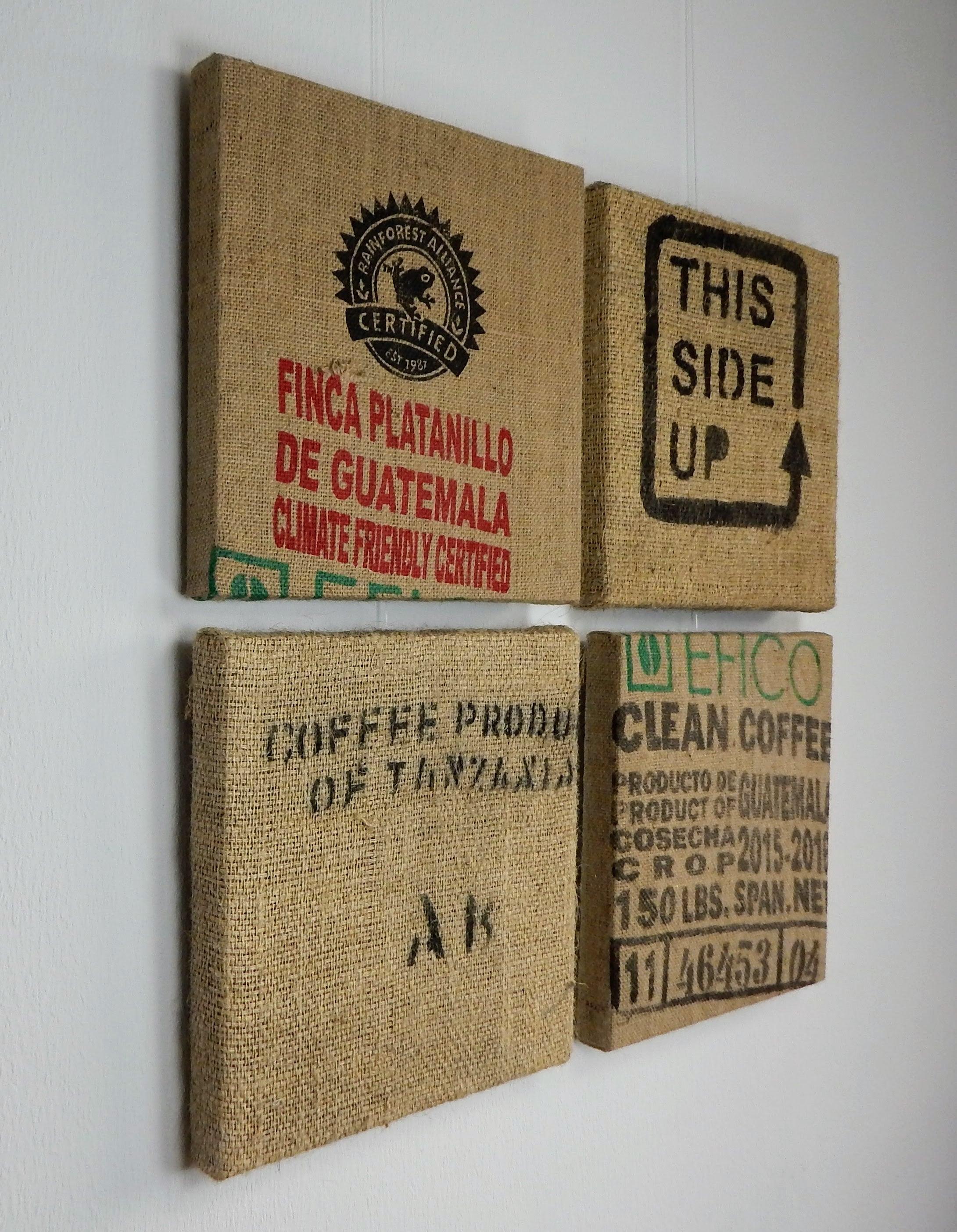 Unieke set van vier akoestische panelen gemaakt van geupcyclede jute koffieboonzakken van over de hele wereld. Gebruikt om koffiebonen te verschepen, maar nu de koffie op is onderdeel van een set hoogwaardige akoestische panelen. Dankzij de open structuur is jute ook per ongeluk een uitstekend materiaal voor akoestisch gebruik. Koffiezakken uit Brazilië, Argentinië, Guatemala, Honduras, Tanzania, Burundi, Mexico, wat hangt er straks bij jou aan de muur?